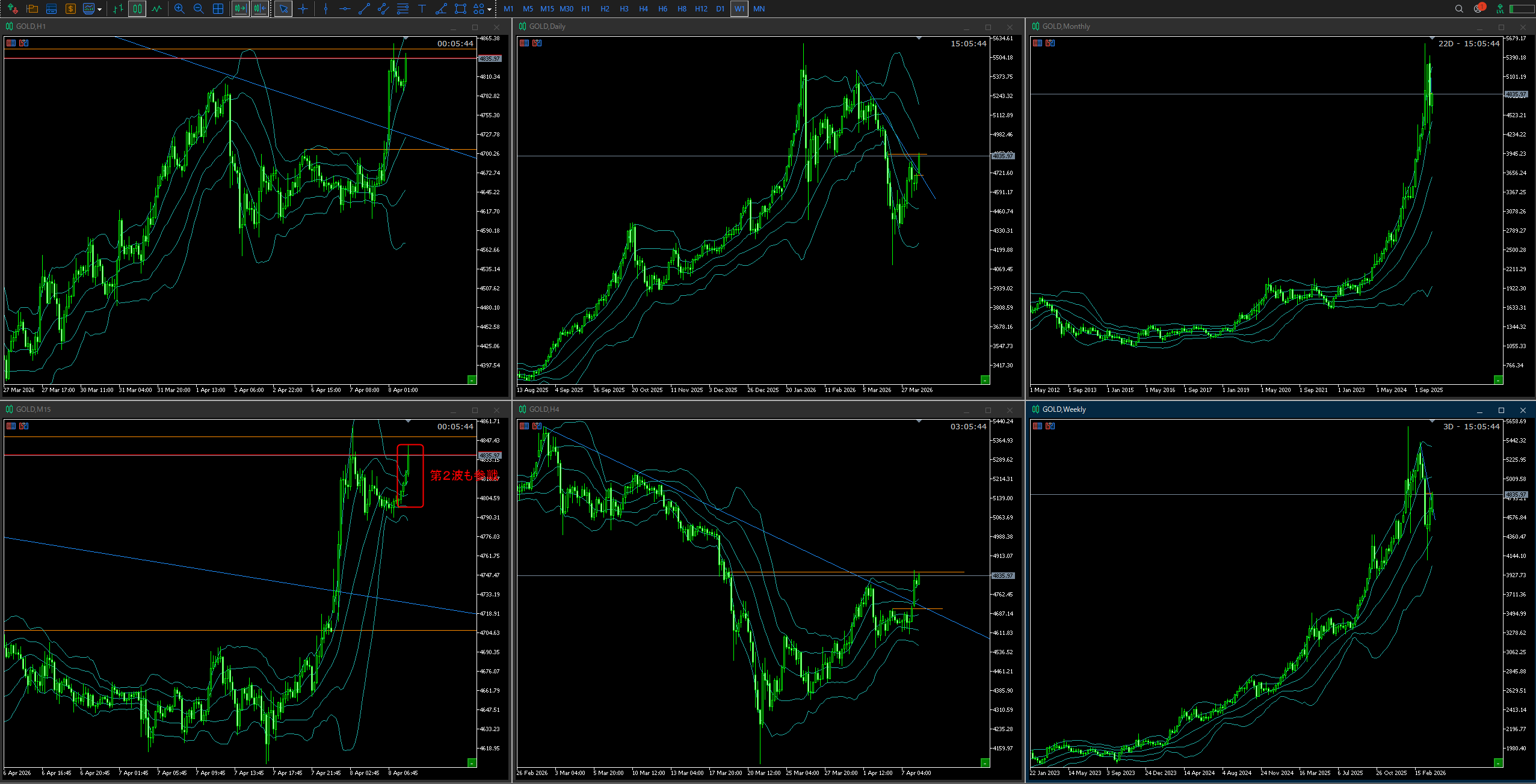 また、4時間足がエクスパンションすると、なかなか1時間足の形は崩れないので、1時間足の第2波も取りました。