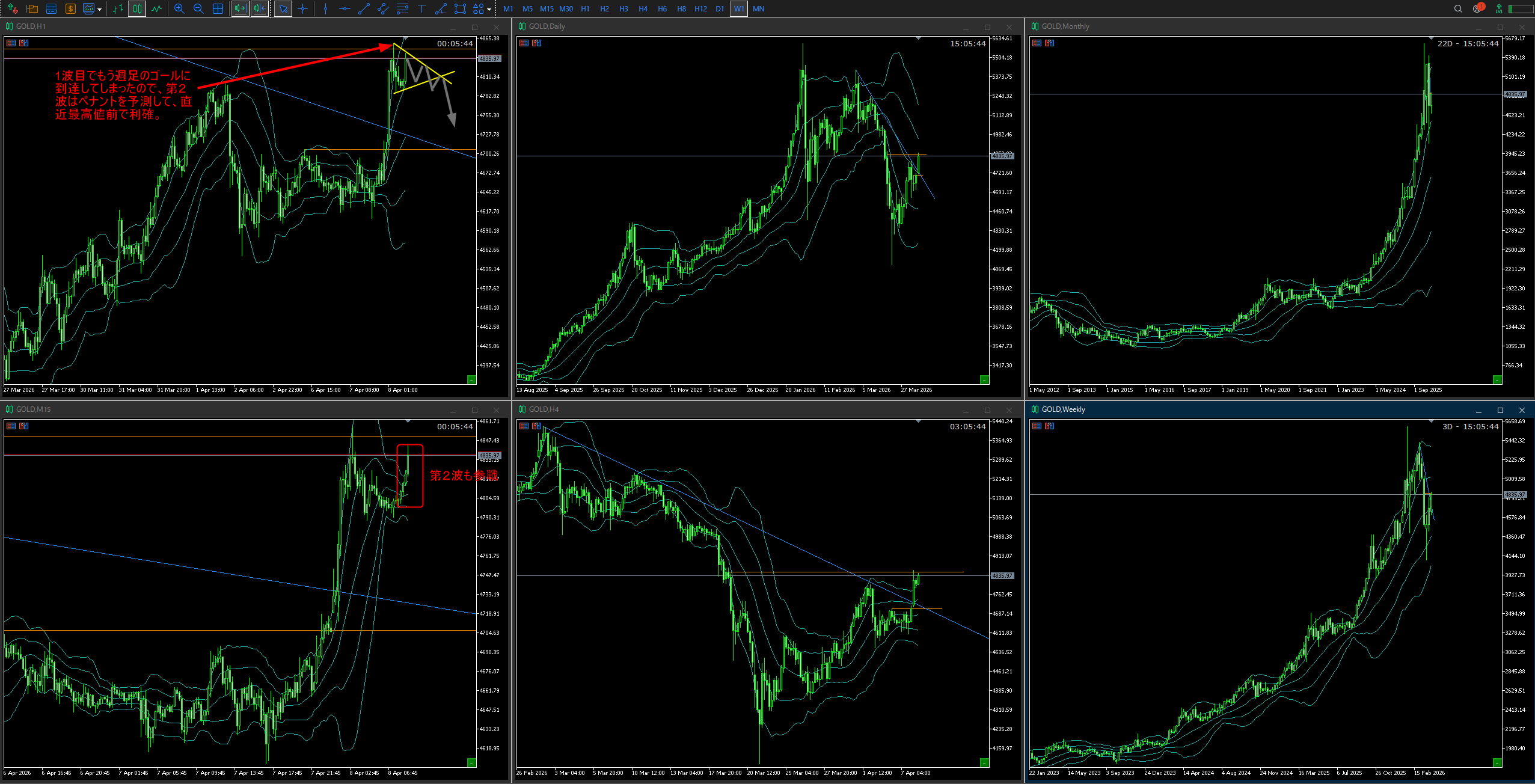 ただ、4時間足の第1波目で週足の目標値に達してしまったので、1時間足の第2波は、ペナント(またはフラッグ、ダブル・トリプルトップなど)になることを予測して、直近最高値の手前で利確しました。