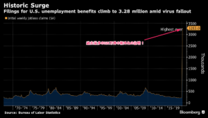 昨日、米国新規失業保険申請件数が過去最多の328万件の桁外れの急増になり、米国の景気も益々グレーになってきました。