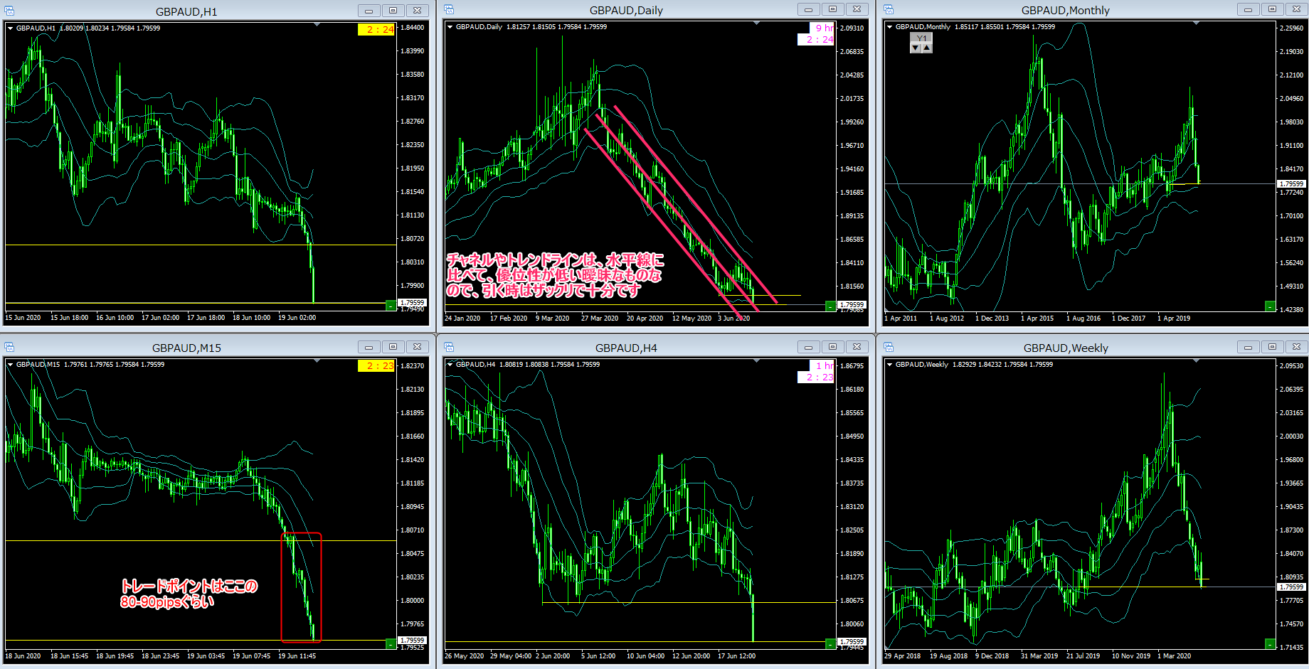 しかし、トレンドが強い場合、チャネル上限から再度下落することもあります。
