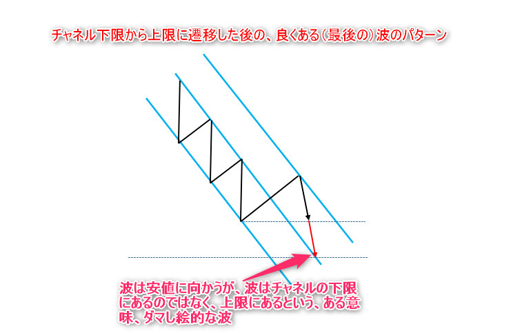 その波形とは、下図のように、チャネル下限から上限に上がって来た時に出現する波形です。