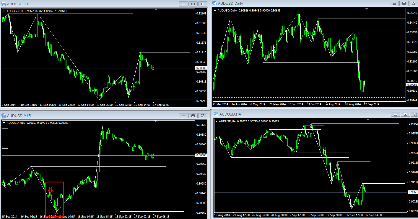 2回目は、想定どおり、1時間足レベルでのレンジ下限付近で止まりました。頭の中では、4時間足レベルのレンジから少しはみ出るぐらいだと思っていました。