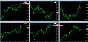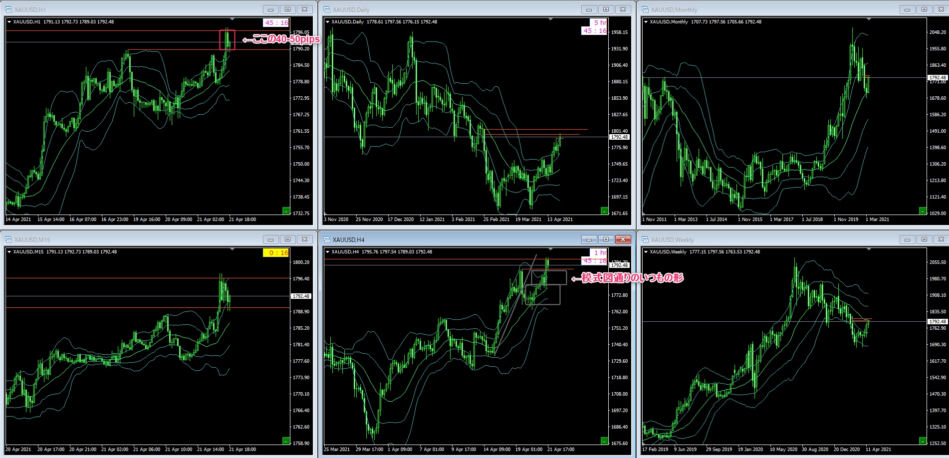 昨日、午後までGOLDは下目線で、下方向を狙っていたのですが、結局、4Hミドルバンドを下抜けず、そこから上がってきてしまったので、夜からは目線を上に持っていきました。