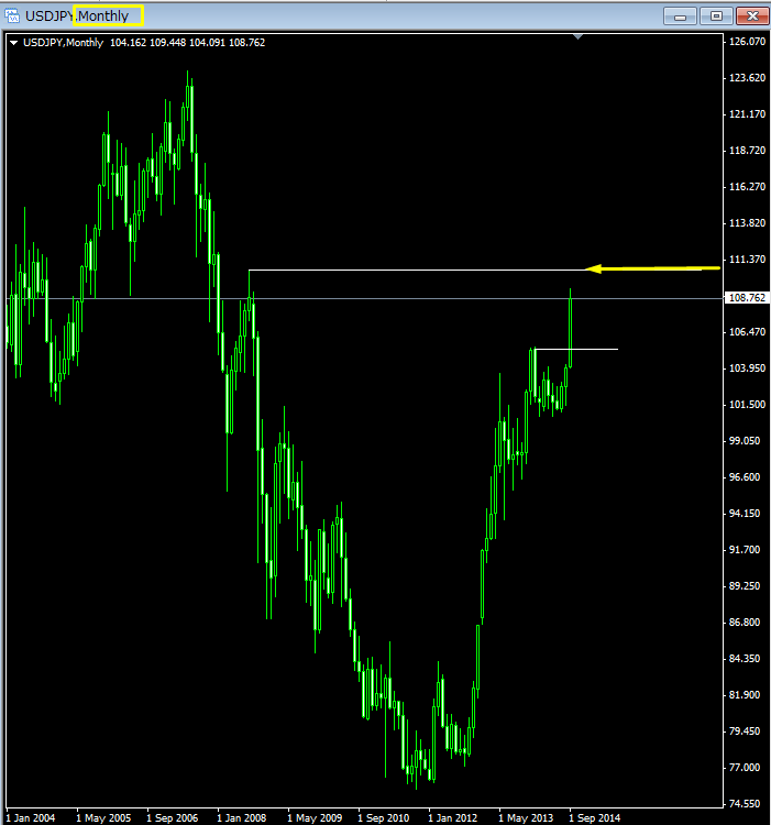 USD/JPYは月足レベルで黄色の矢印付近が当面の目標です。