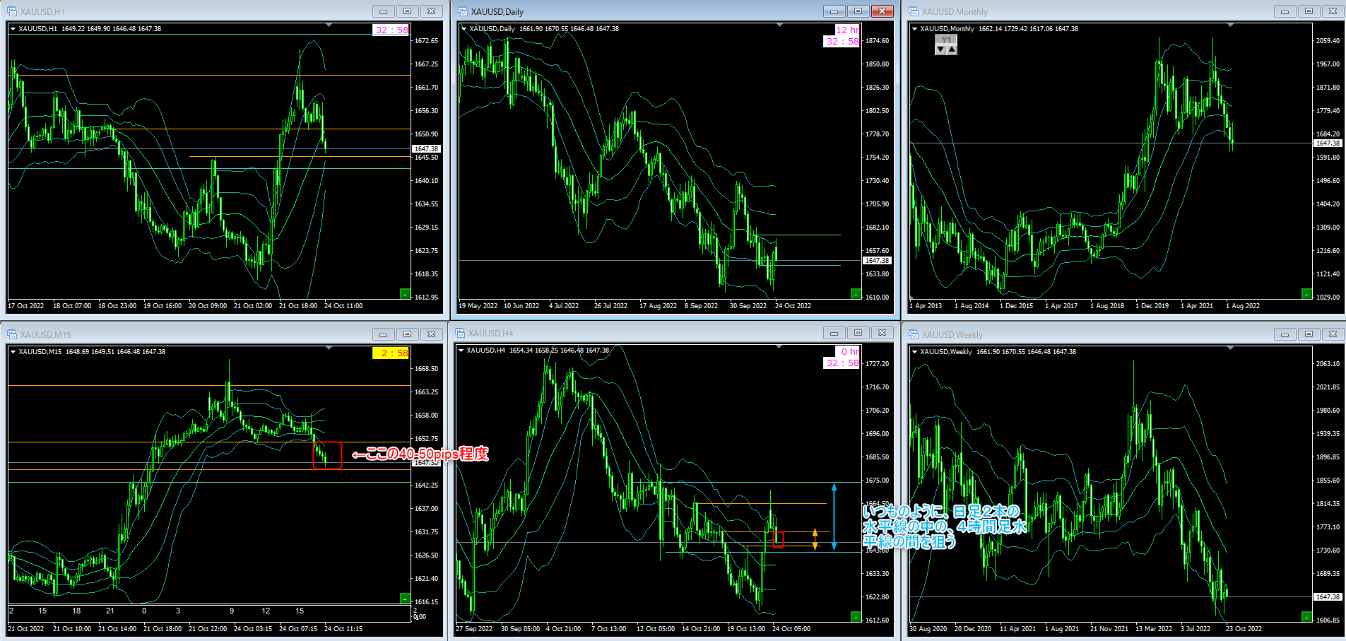 もし上位足の環境分析がしっかり出来るようになれば、日足と4時間足の水平線が生き生きとしだすので、是非、上位足の環境分析をマスターして見てください!