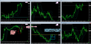 よって、週足の転換点付近に達したら、現在上側で浮遊している4H(&日足)は一時的に中心線付近まで下落し、再度上限へと上昇して行きます。そして、徐々に上値が重くなり、中心線を下回り、下段へと遷移して、そこでまた揉んでから、中心線に頭を押さえられ、最後に週足に回帰していくようなイメージです。(*あくまでも一例ですので、絶対ではありません。あしからず・・・)