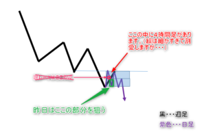 もしそうなるのなら4時間足レベルで結構上下が大きなワイドレンジになるので、取り方はアレが良いかもしれません。