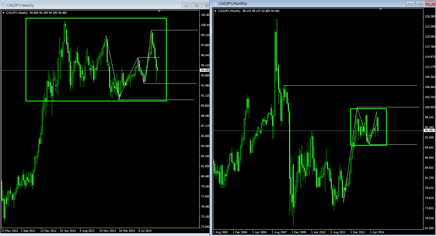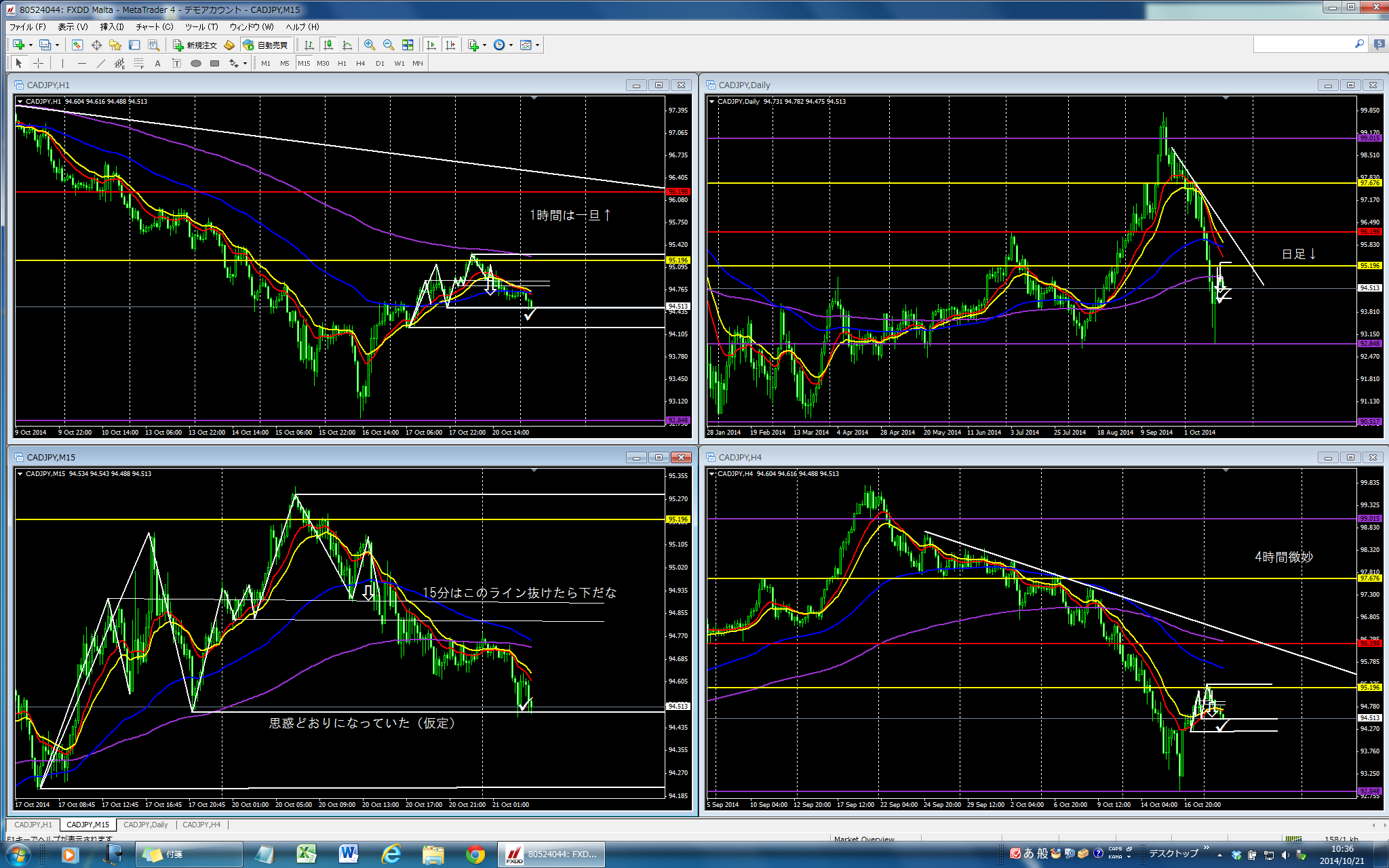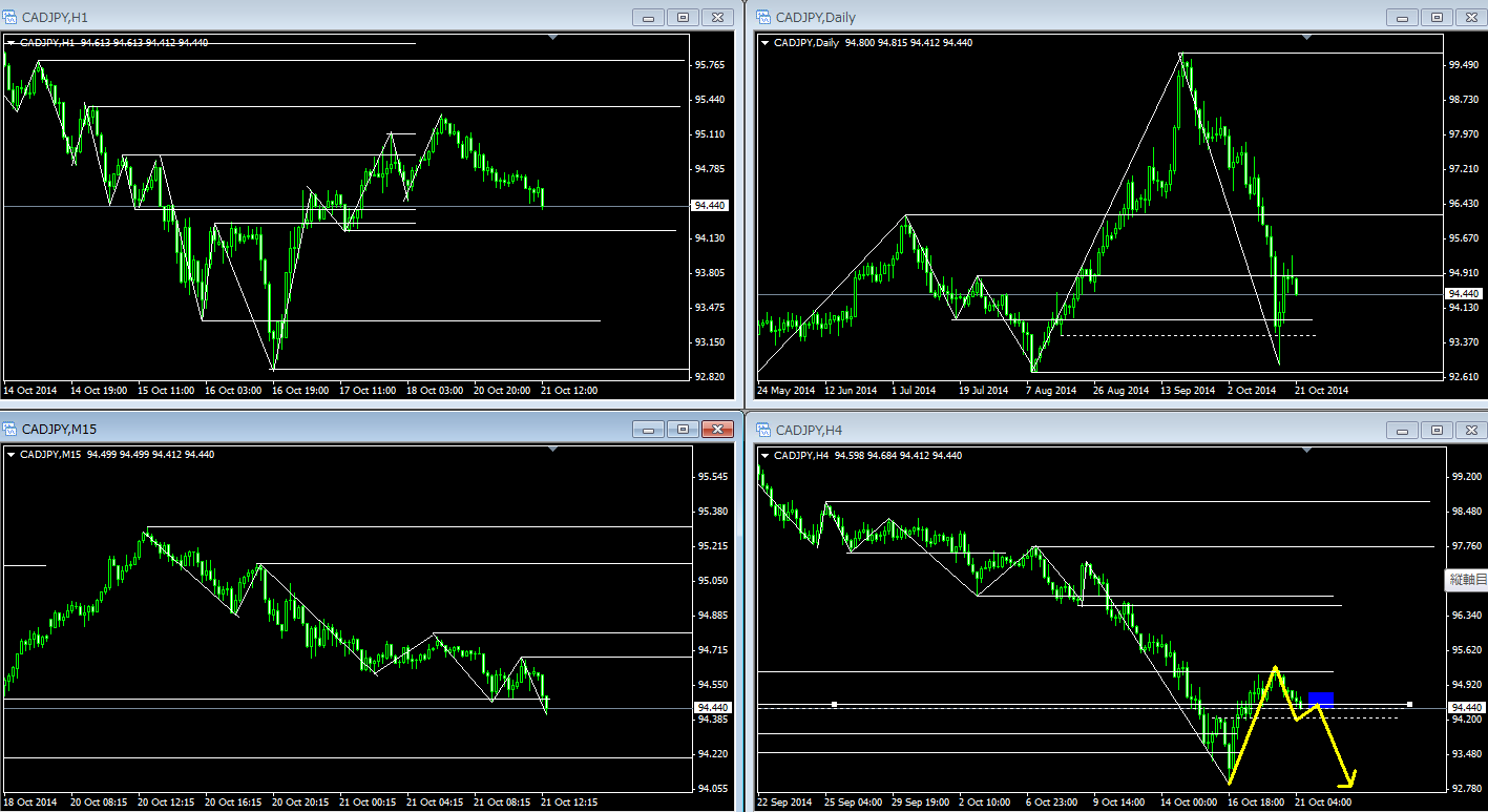 この時同時に監視していたのは、添付のCADJPYです。こちらのほうが上位足が転換を明確に示唆していないので、こっちのほうがいいかな~と考えましたが、15分足のダウがEURJPYのほうが綺麗に出ているので、「こっちにしょう」と安易に考えてエントリーしました。