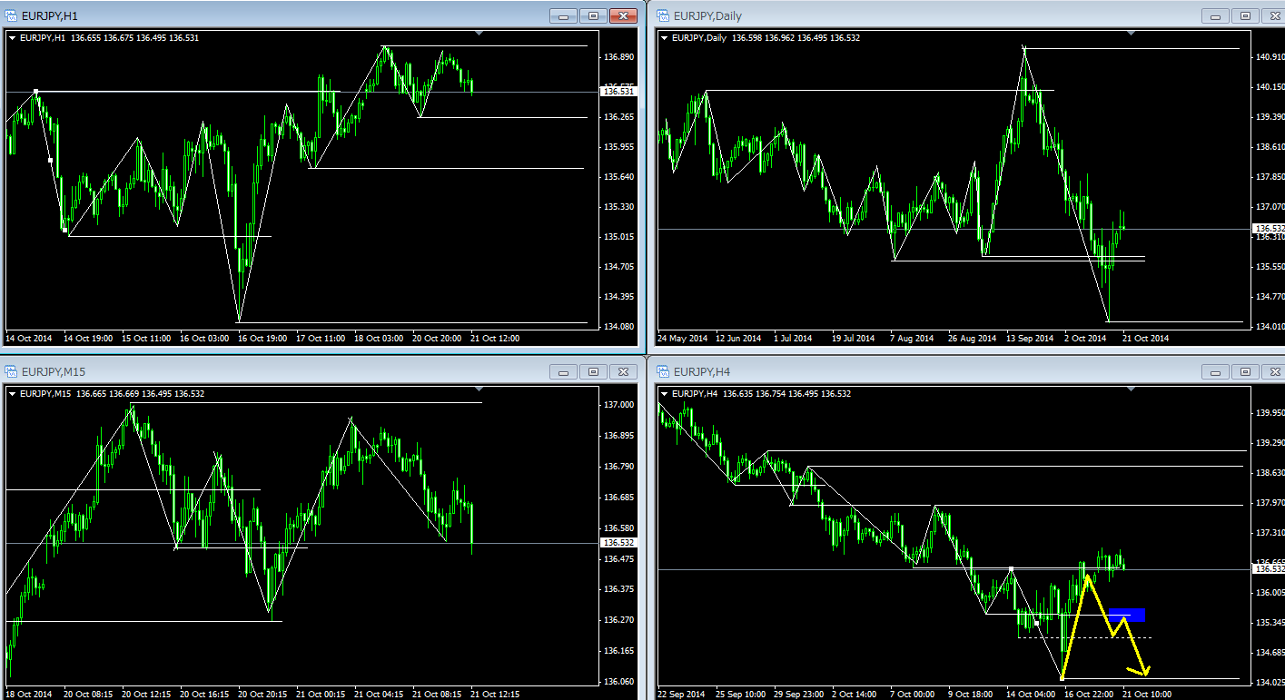 因みに、現在のEUR/JPYとCAD/JPYはどの時間足が戦っているのかというと、現時点では、EUR/JPYは「日足 vs 4時間足」、CAD/JPYは「4時間足 vs 1時間足」です。