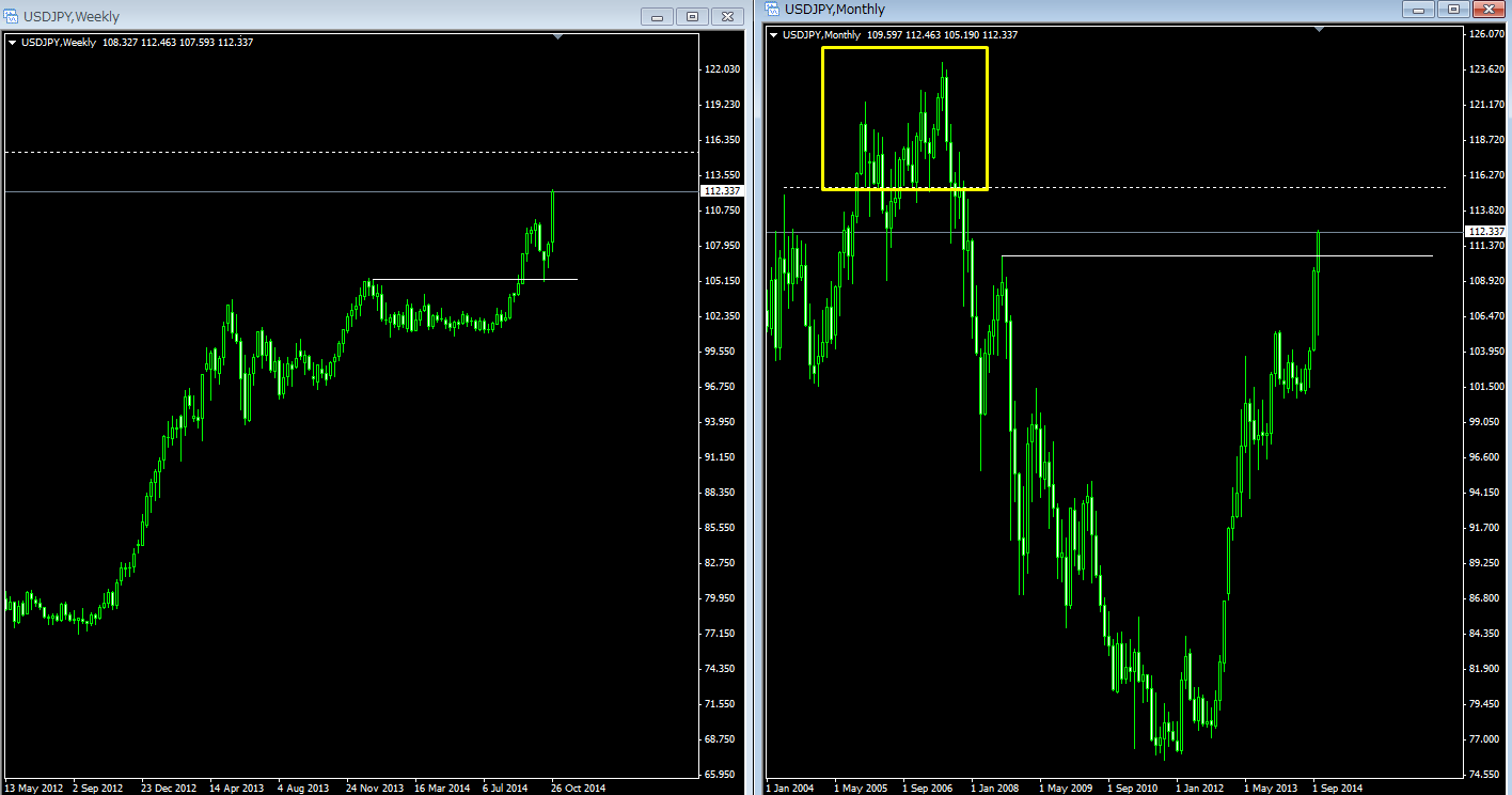 ところで、今後のUSD/JPYですが、下図のレジスタンス付近まで完全に上目線です。その後、月足レベルで1年以上もみ合っている超巨大な転換点(レンジ)があるので、そこは素直には上に行かしてくれないと思います。