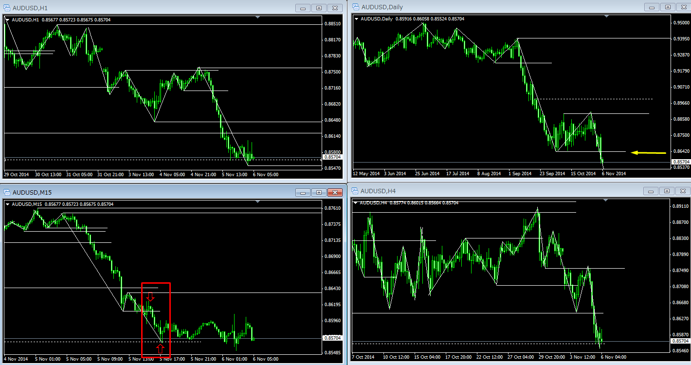 特に、AUD/USDは日足レベルの長い転換期をやっと下抜けしたので、大きく伸びるのかなと思いましたが、期待はずれでした。