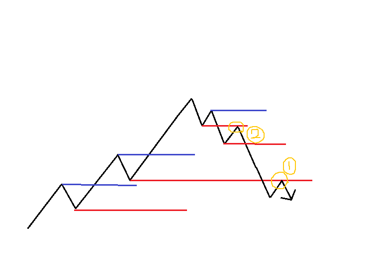 まず、明確なトレンド転換は昨日の教えやマニュアルからすると前の流れのレジサポが役目を逆にしたら明確なトレンド転換だと教えて頂きましたが(模式図①時点:これはサポートがレジスタンスに)もし、その前に山谷を作って波ができていたら(模式図②時点)でトレンド転換と考えて良いのでしょうか?
