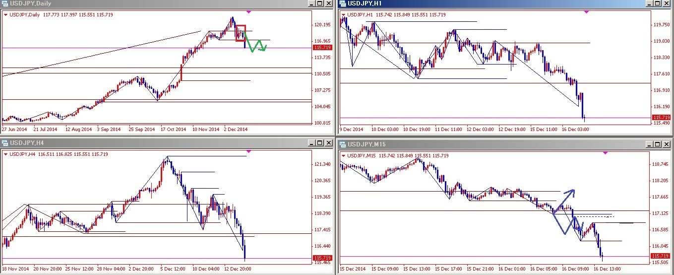 日足は以前のブログで日足VS4時間足のところで教えて頂いたとおり赤枠で暫定的ですが上の波が全戻しでレジスタンスに抑えられここから下落しようとしてました。ただし、117.22のラインで再び上昇があるので注意が必要。