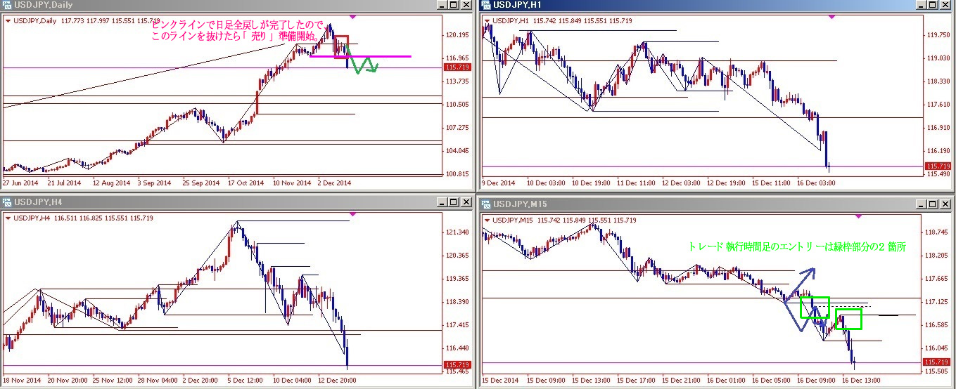 そして、日足レベルで流れは下ですので、15足レベルで戻し目をつけて、第2の目標値を目指して再下落しました。