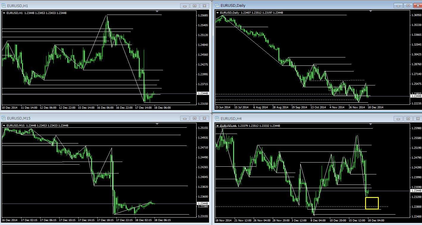 因みに、現在のEUR/USDは日足&4時間足レベルのワイドレンジになっているので、狙うとしたら下図の黄色枠部分です。