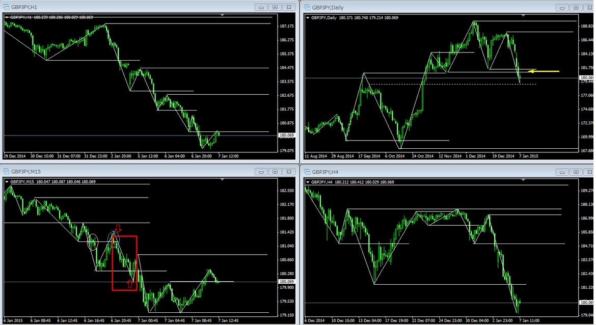 ■GBP/JPY・・・これは質問1の答えですね。「4Hのサポートだけでなく日足のサポートもあった」ことも意識しつつ、クロス円は多通貨ペアーに引っ張られることがあるので注意しましょう。