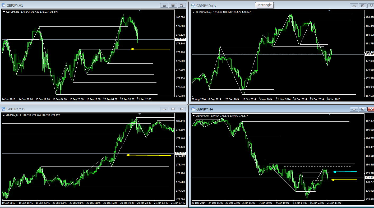 私の選択したUSD/JPYも4時間足レジスタンス(水色矢印)まで我慢して持っていたら100PIPSぐらいいけたのですけど、我慢しきれずに途中で利確してしまいました^^;)