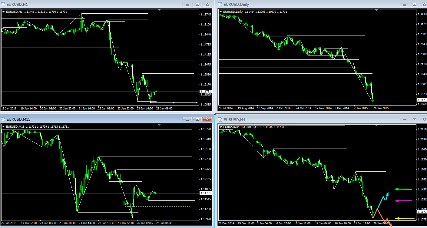 ■GBP/USD・・・基本、下目線です。下で狙う場合は、黄色の矢印付近を抜けてから。上で狙う場合は、ピンクの矢印から緑の矢印付近までが第一目標(多分、そこまで届かない気がしますが。。。)。