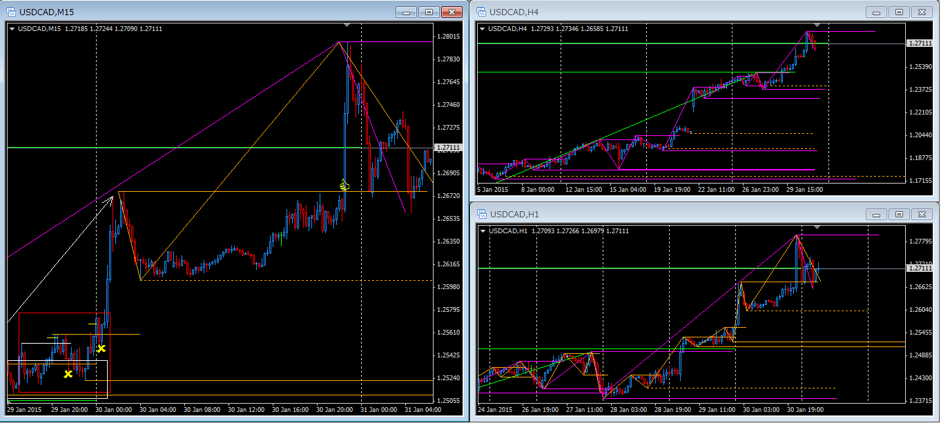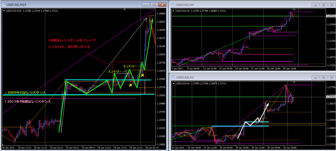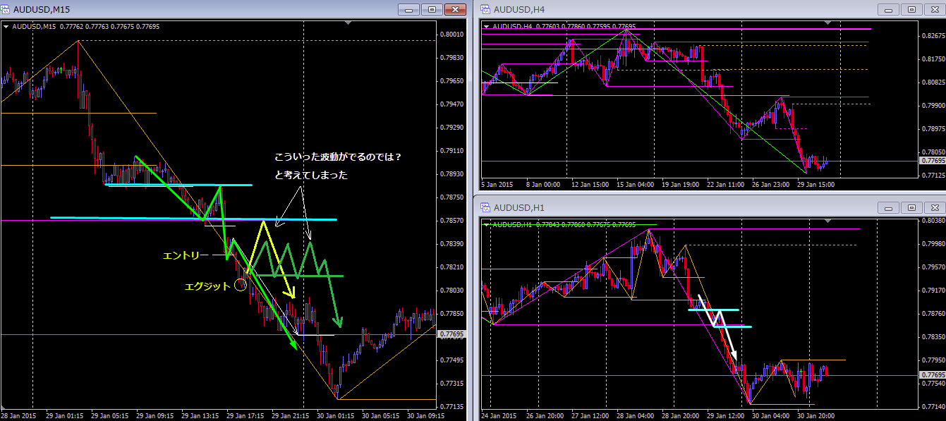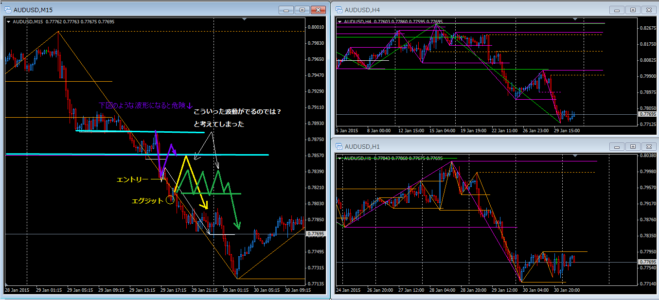 エントリーポイントでの15分足の波動にいくつかパターンがあるように思いました。