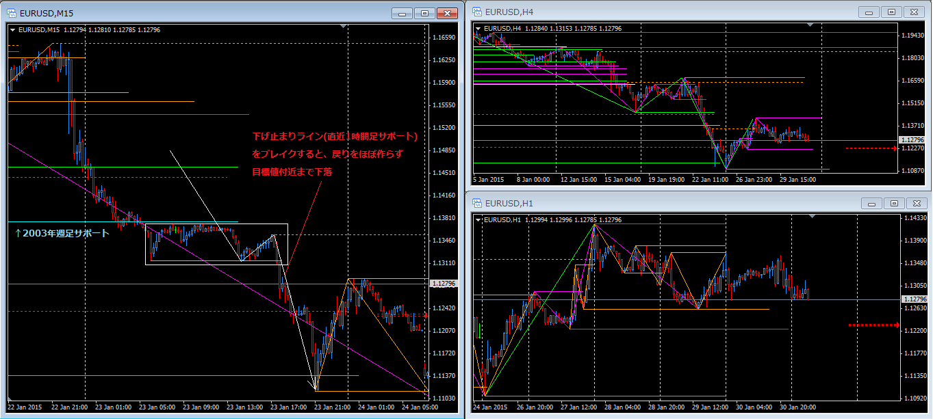 とくに黄色矢印のように4時間足サポート付近まで戻ってしまうと、30~40pipsも含み損が出てしまうので、ロスカットしてしまうと思います。