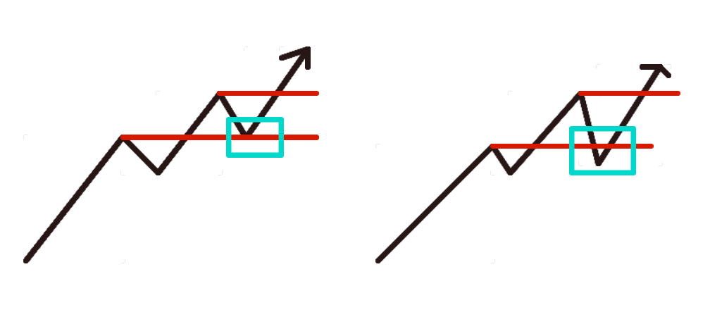 青ラインのように、レジスタンがサポートにかわる前に、レンジに戻ってきていますよね?