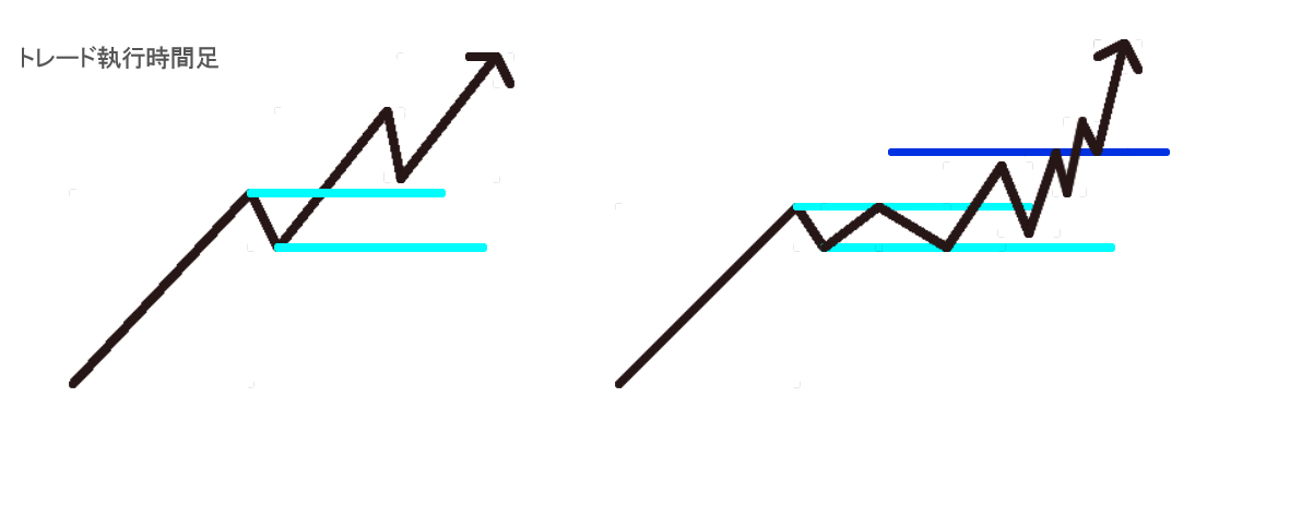 ポイントは、下図のように、レジがサポに変わって上に放たれるか、それとも、レジがサポに変わらずダラダラとレンジ幅を広げているだけなのか、を見極めることです。