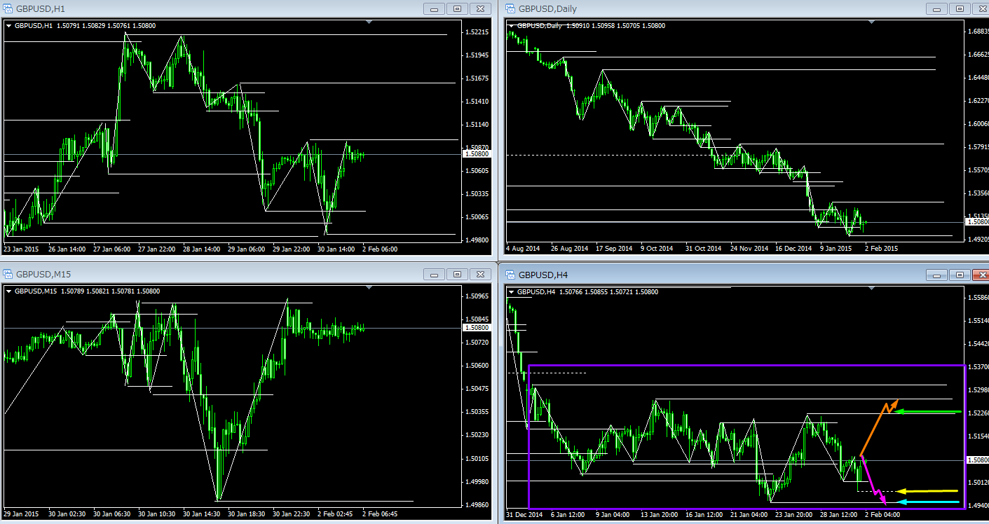 ■GBP/USD・・・EUR/USDと同様、下降トレンド中です。4時間レベルでの細かいエントリーポイントは下図の矢印部分ですが、できれば、紫枠を抜けてから、エントリーしたいです。