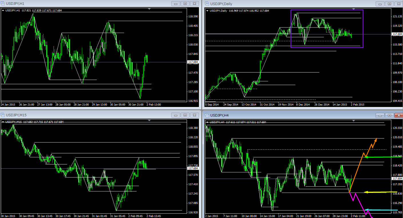 ■USD/JPY・・・現在、大きなレンジです。4時間足レベルでは下図のようなイメージですが、出来れば日足の紫枠を抜けた(or 抜け見込み)辺りから、この通貨ペアーに向き合いたいです。