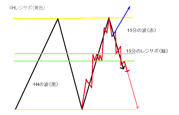 そのような状態の中で、レートが4時間足の真ん中ぐらい(緑のライン)から、いきなり市場の同意が集まって上に行くとは基本的には考えられません。
