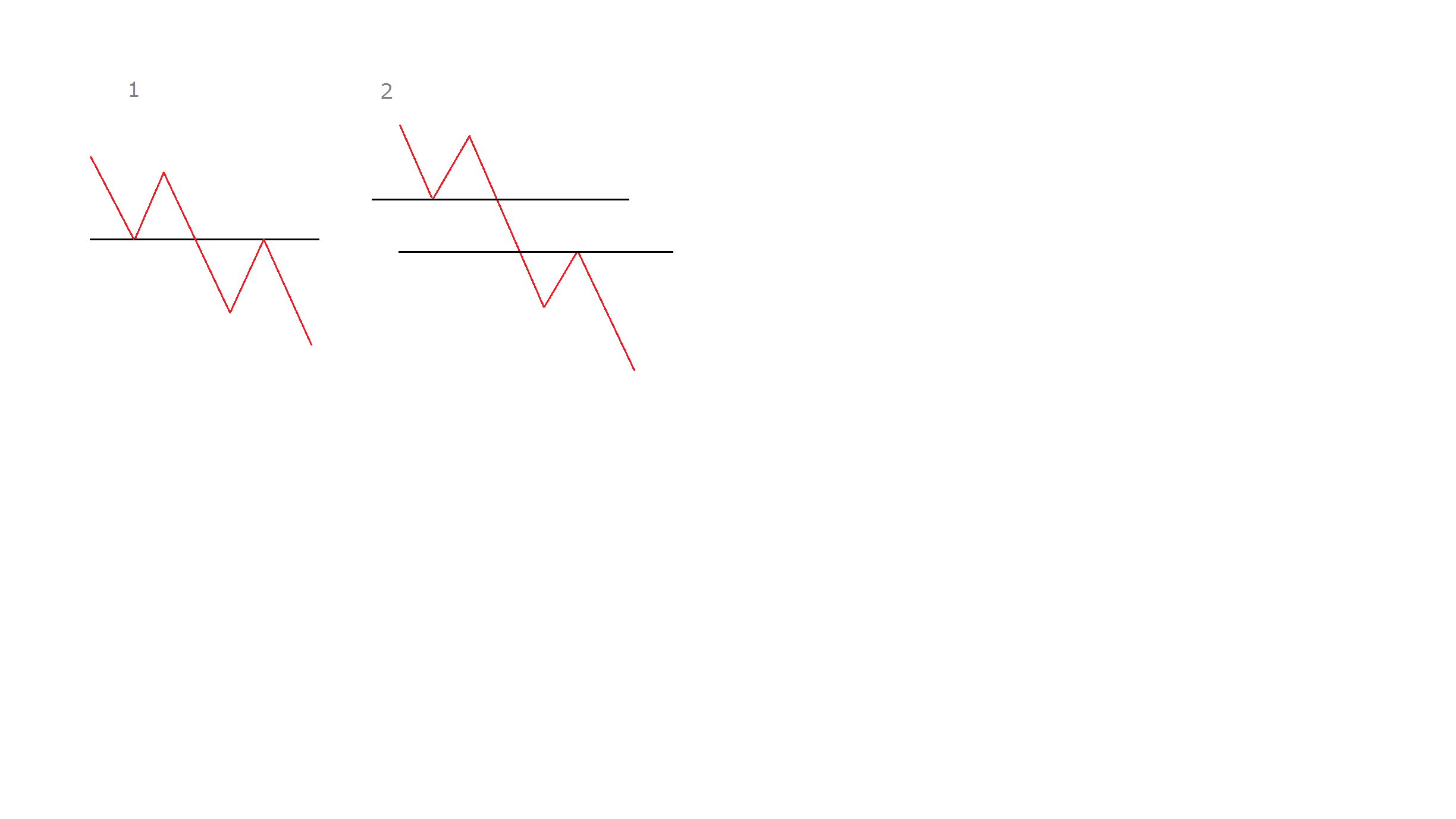 次に、「水平線が離れている場合でもその効果は同じなのでしょうか?」という質問ですが、これは正直意味が分からないのですが、自分なりに頑張って解釈すると、下図のように、2本抵抗線があり、戻し売りはどこが適切ですか、という意味でしょうか?