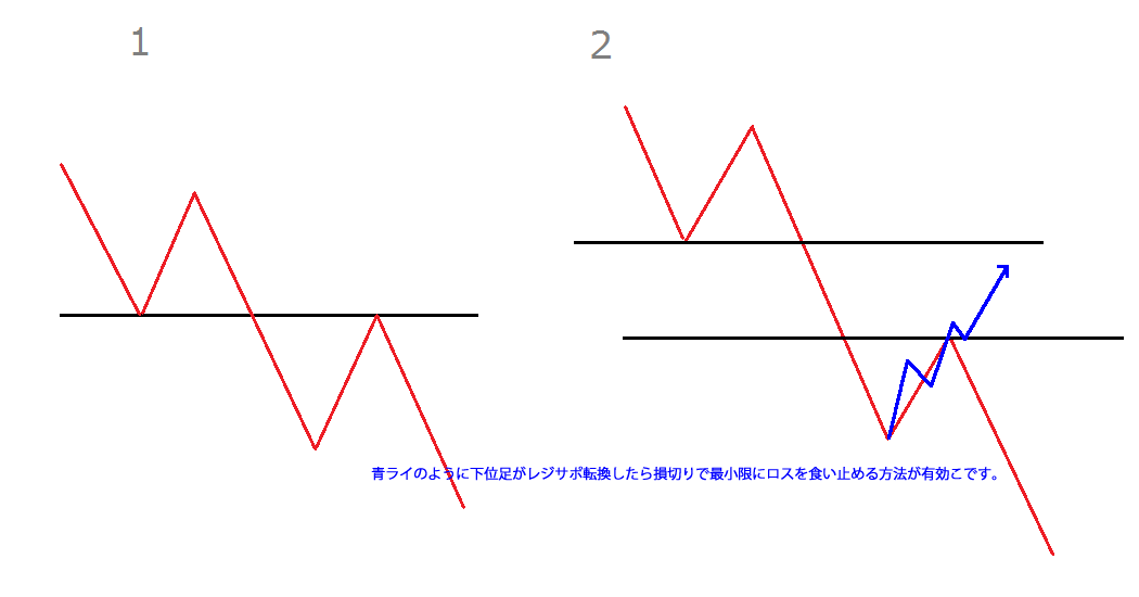 但し、青ラインのように、2本目のラインでレジサポ展開するようであれば、1本目のラインまで損切り幅が耐えられない場合は、直ぐに損切りです。
