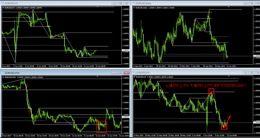 逆に、4時間足レベルで下値を切り上げたら、波が上値切り上げ&下値切り上げになるので、波が上にいく可能性があります。