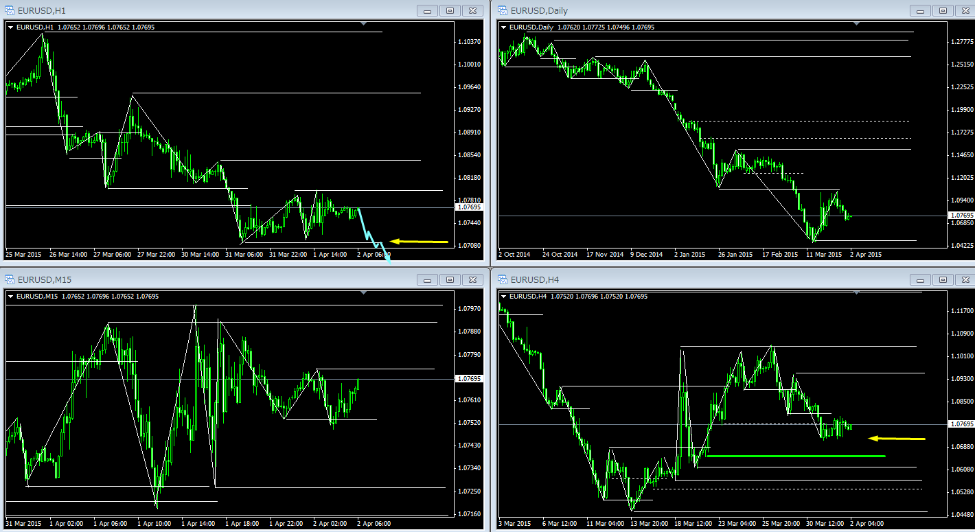 さて、本日のEUR/USDですが、20時30分に「欧)ECB理事会議事要旨(3月5日開催分)」があるので、下図のように1時間足レベルでレンジブレークがあるかもしれません。
