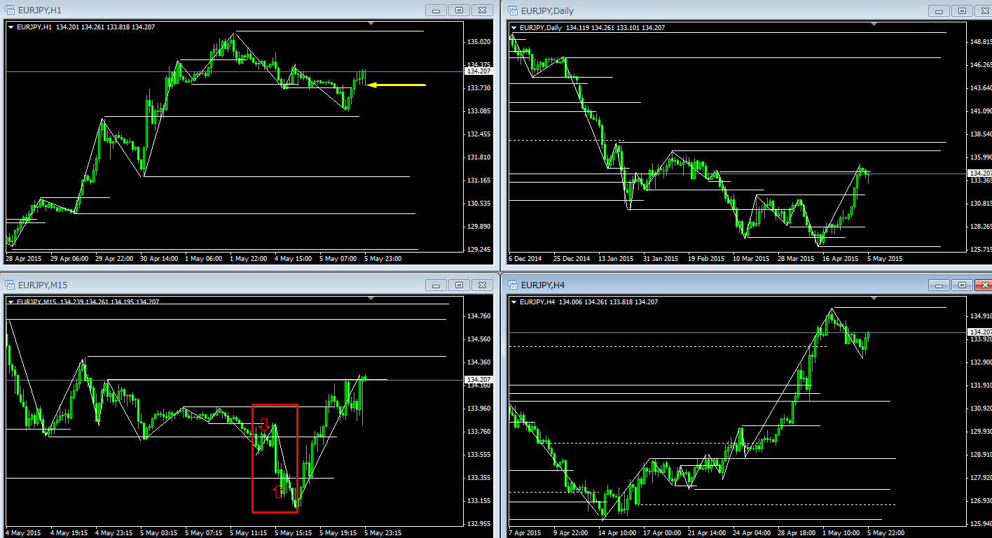 このエントリー理由は、1H黄色の矢印部分が抜けたので、レジサポ転換しそうになった時に、戻し売りを仕掛けました。