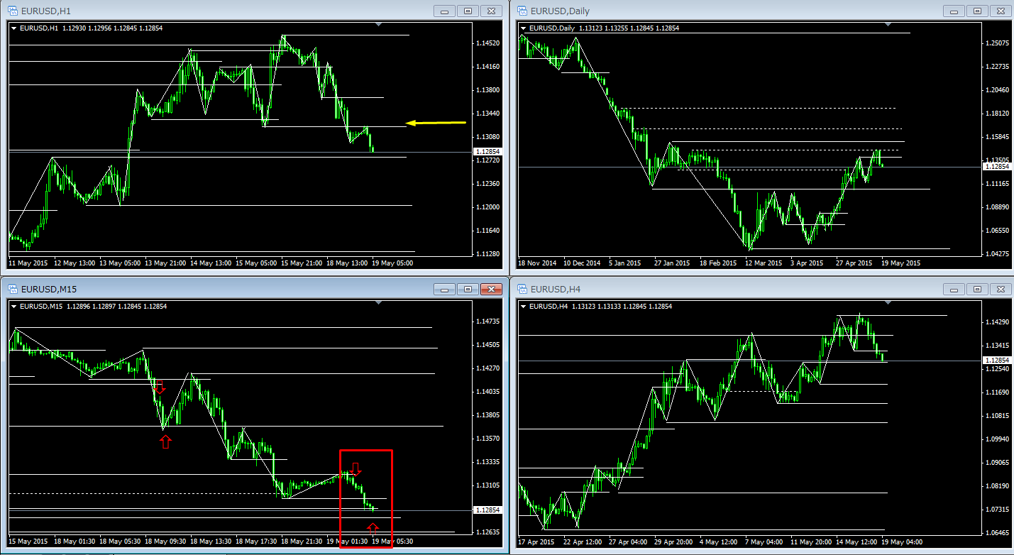 昨日も同じなのですが、上位足がレンジである場合は、下位足で波が小刻みに止まる場合があるので、ある程度の目標値に来たら、小刻みに手仕舞うことが大切です。