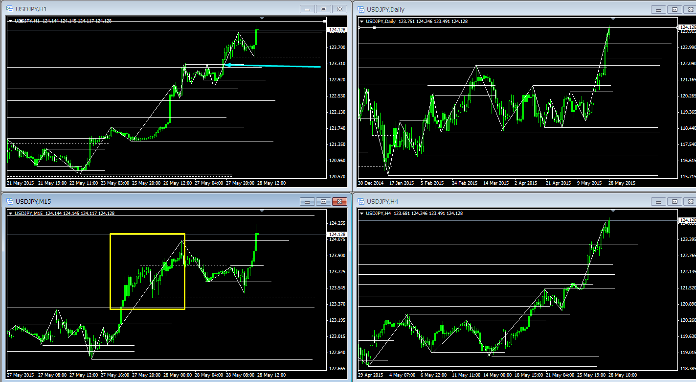 残念な事に、昨日は外出しており、参戦できませんでしたが、USD/JPYでエントリーするとしたら下図の黄色枠内だと思います。
