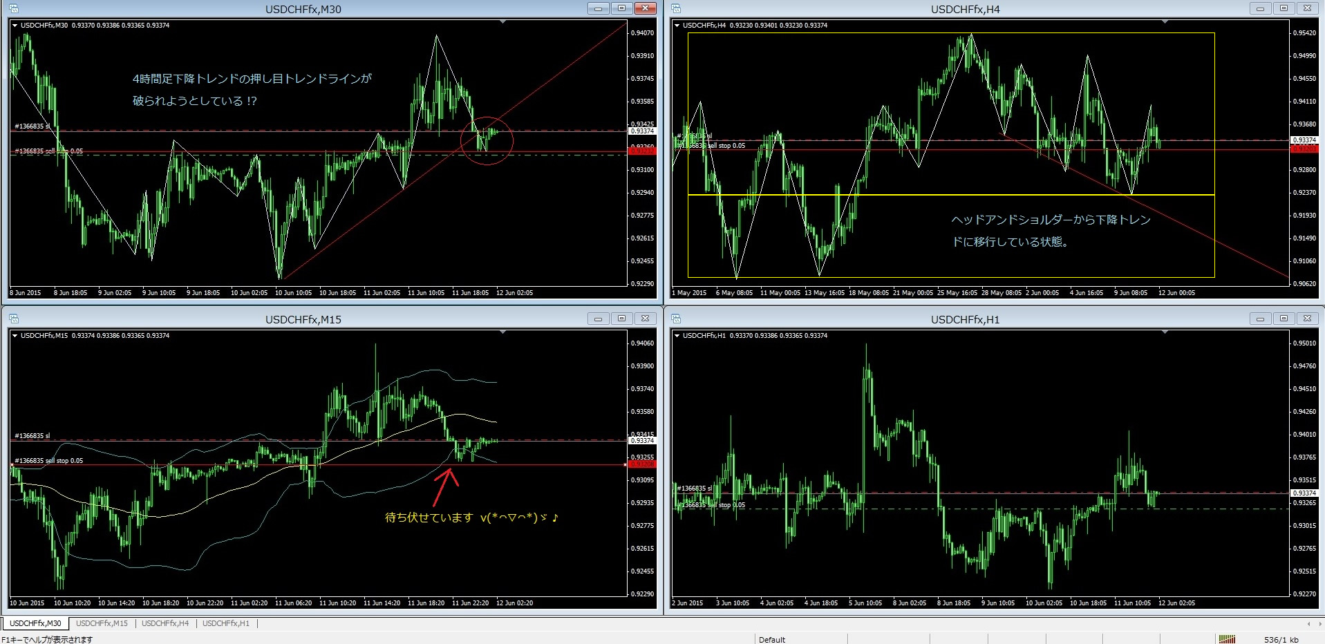 4時間足でヘッドアンドショルダーから下降ダウが形成され、下降トレンド押し目からの戻りに入った段階に見えます。