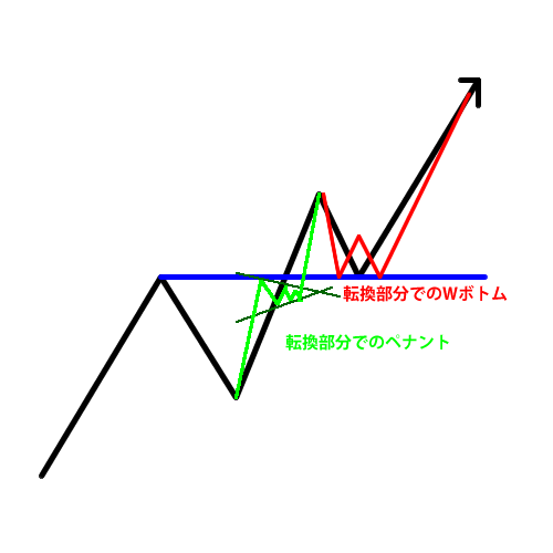 イメージ的には上図の緑ラインのペナント部分です。具体的にチャートで示すと下図になります。