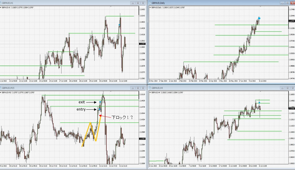 また、下図AUD/JPYも分かり易い髭が黄色矢印付近にあるので、ライン抜けから狙えそうです。