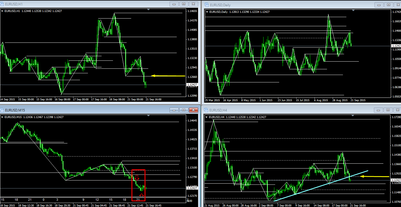 4Hは上方向のダウでしたが、赤ラインから黄トレンドライン付近までを狙いました。