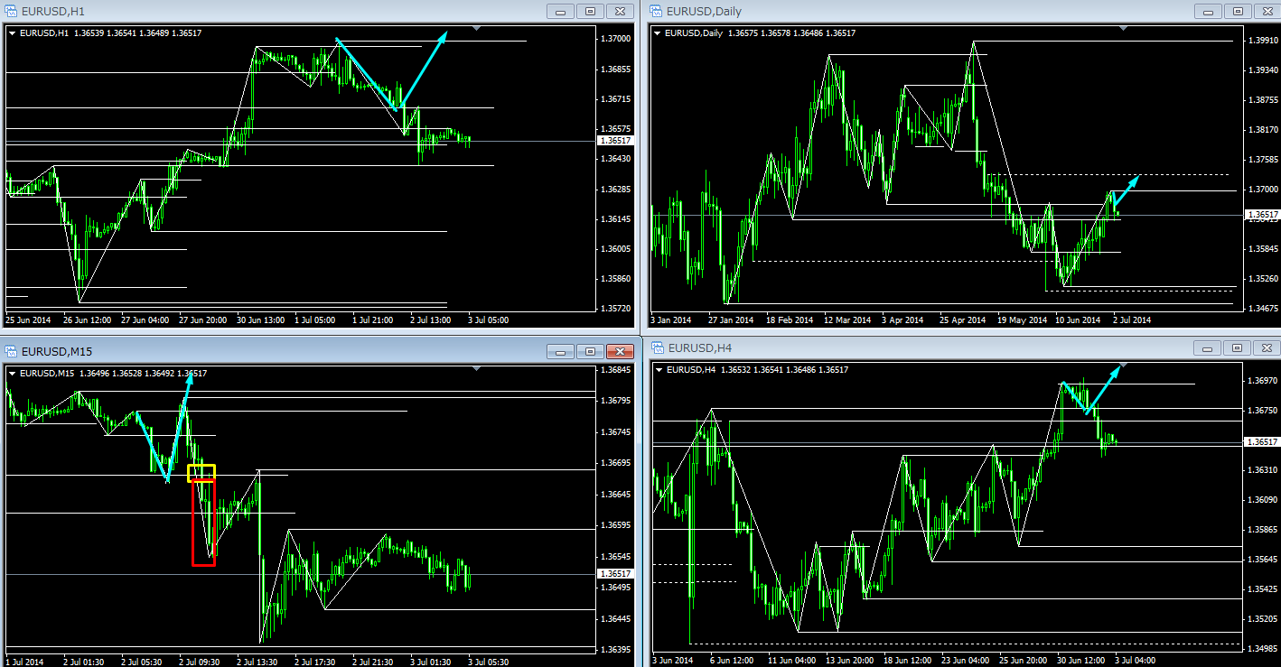 思惑通り、ロンドン市場が開く時間帯で、レートが上に行き、押しを狙ってロングを狙っていたのですが、黄色枠部分で全戻ししてしまい、押し目買いはできませんでした。