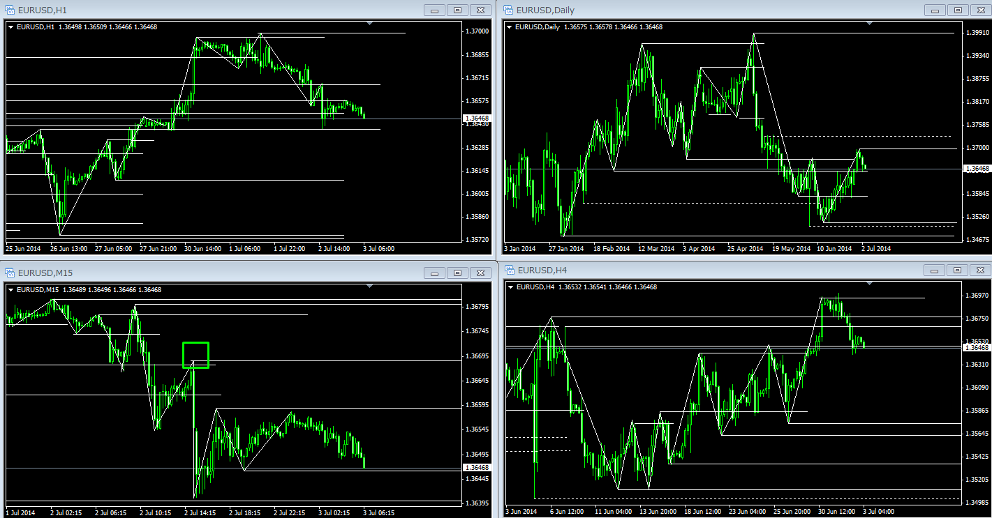 次に、NY時間で下図の緑枠付近で止められていたのが分かったので、今度こそ戻し売りをと思ったのですが、直ぐ後に「米)ADP全国雇用者数」の指標があったので、そこでもエントリーできませんでした。