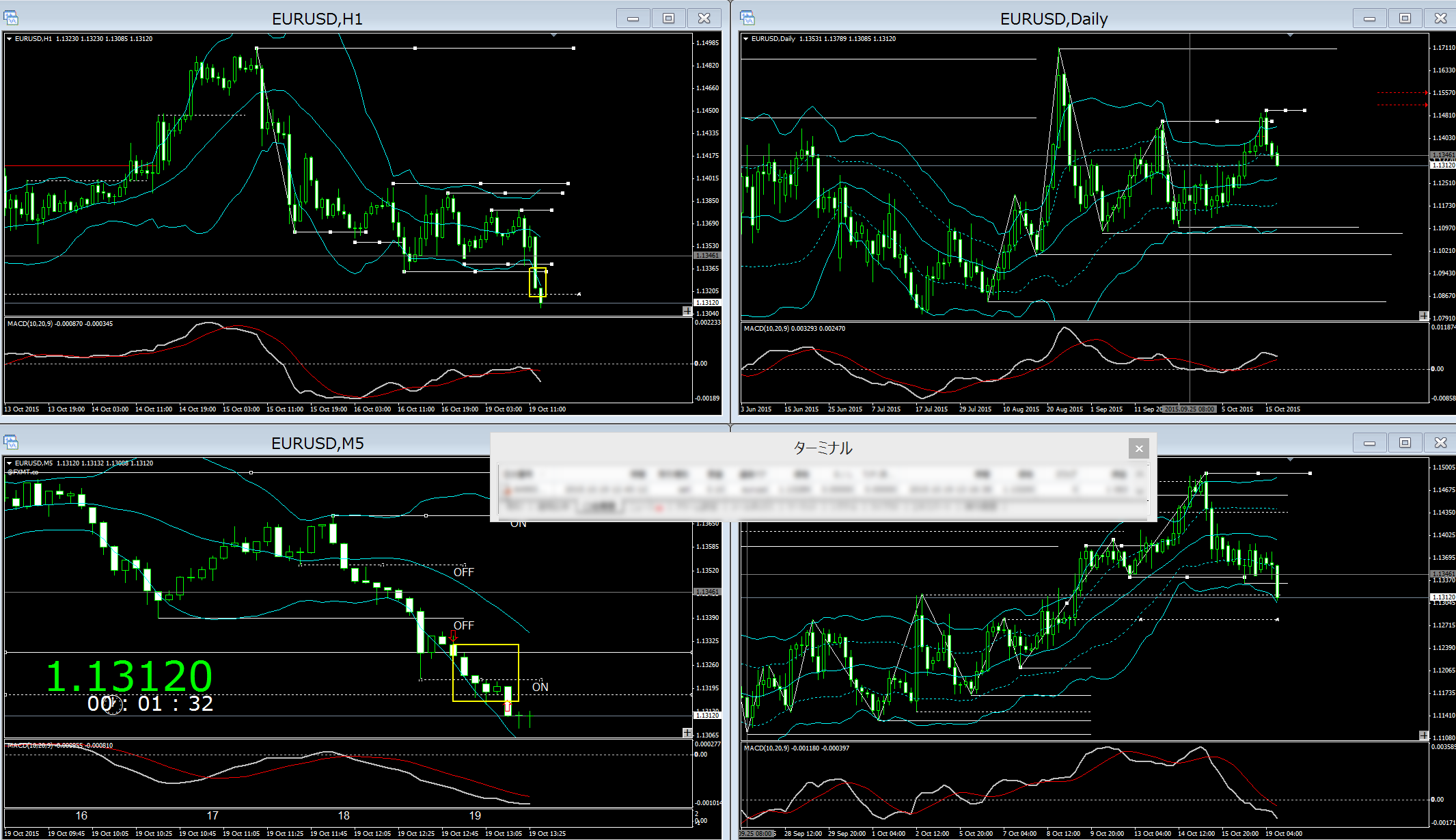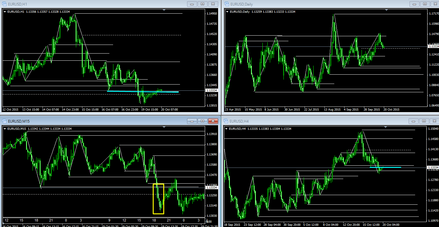 例えば、昨日のEUR/USDは下図の黄色枠のところで、小波が取れました。