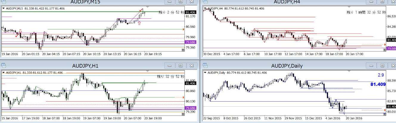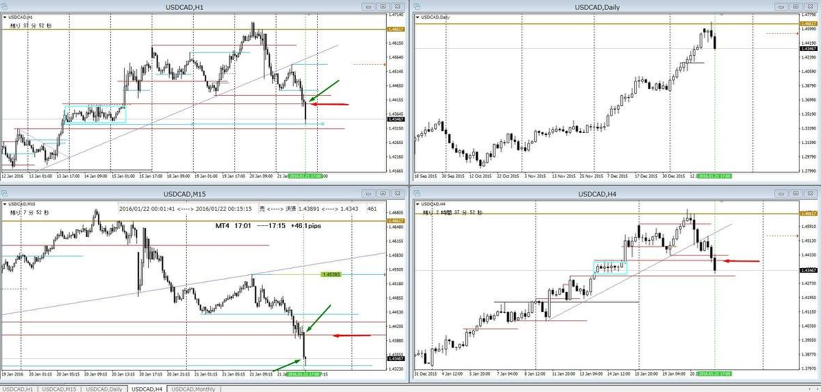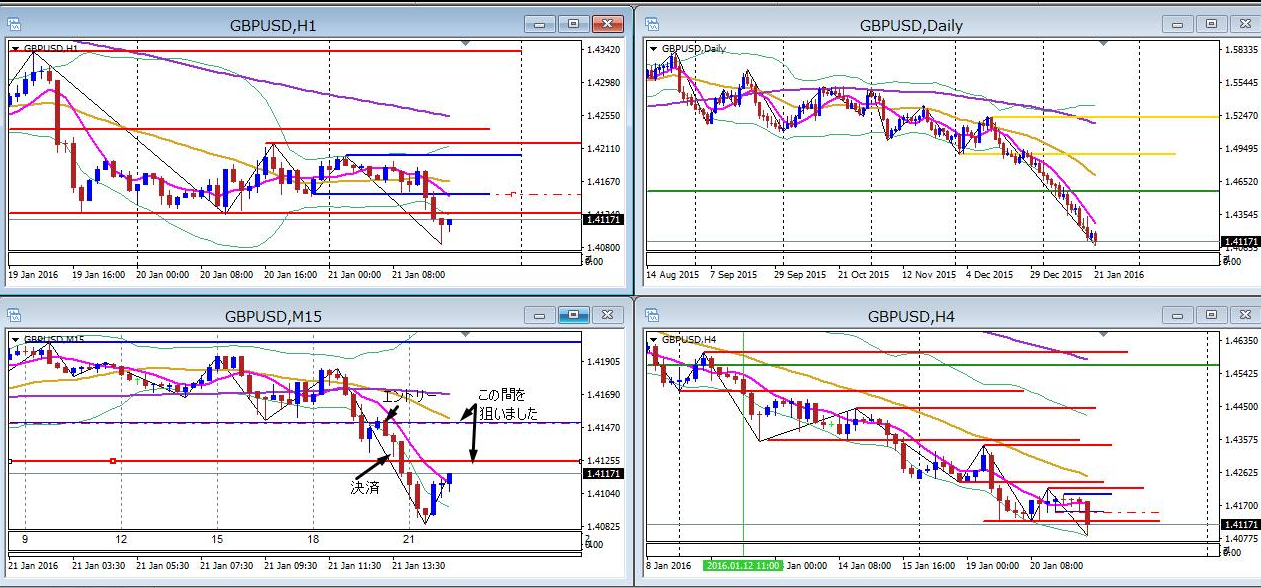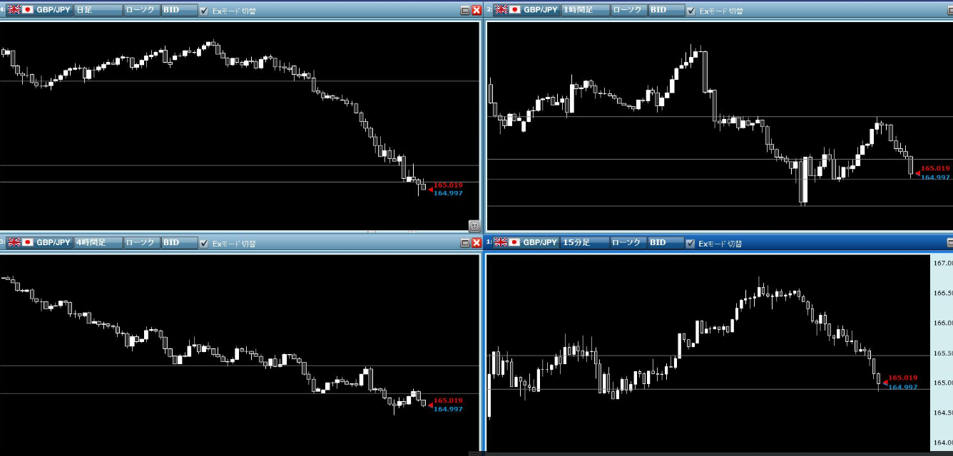 1D→4H↛1H→15M、1D→4H→1H↛15M、も同様です。(分からない場合は、トレードの学校の「レンジ相場、トレンド相場の戦い方」を参照してください)