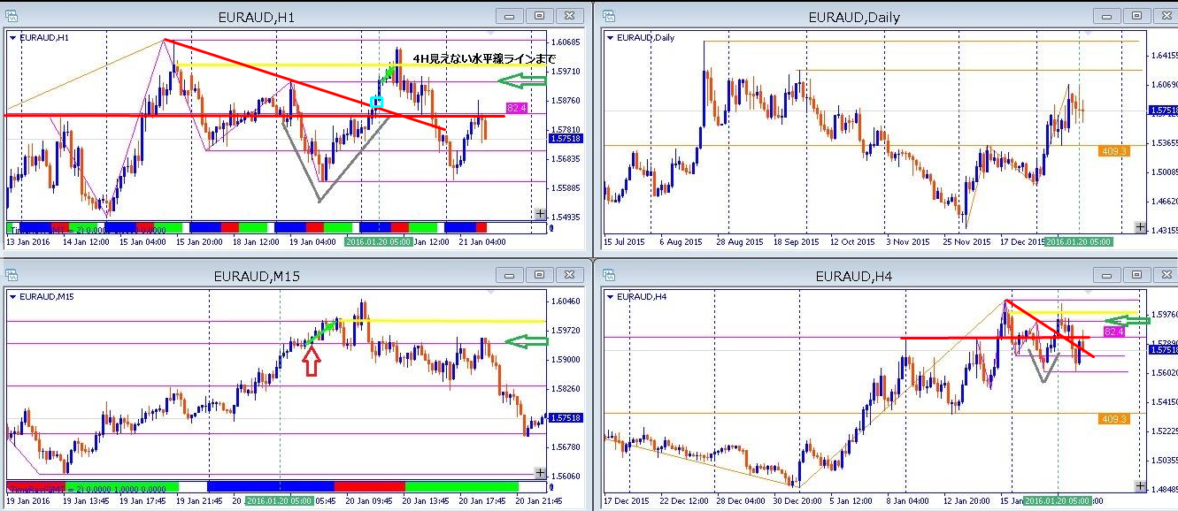 さて、エグジットポイントですが、頂いたチャートを使わせてもらうと、下図の4H黄色ラインになります。