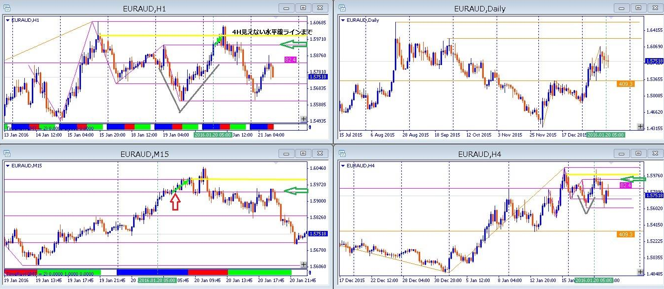 以上を理解していると、4H最高値到達までポジションを保有して、直前で逆行されて、大火傷することはありません。