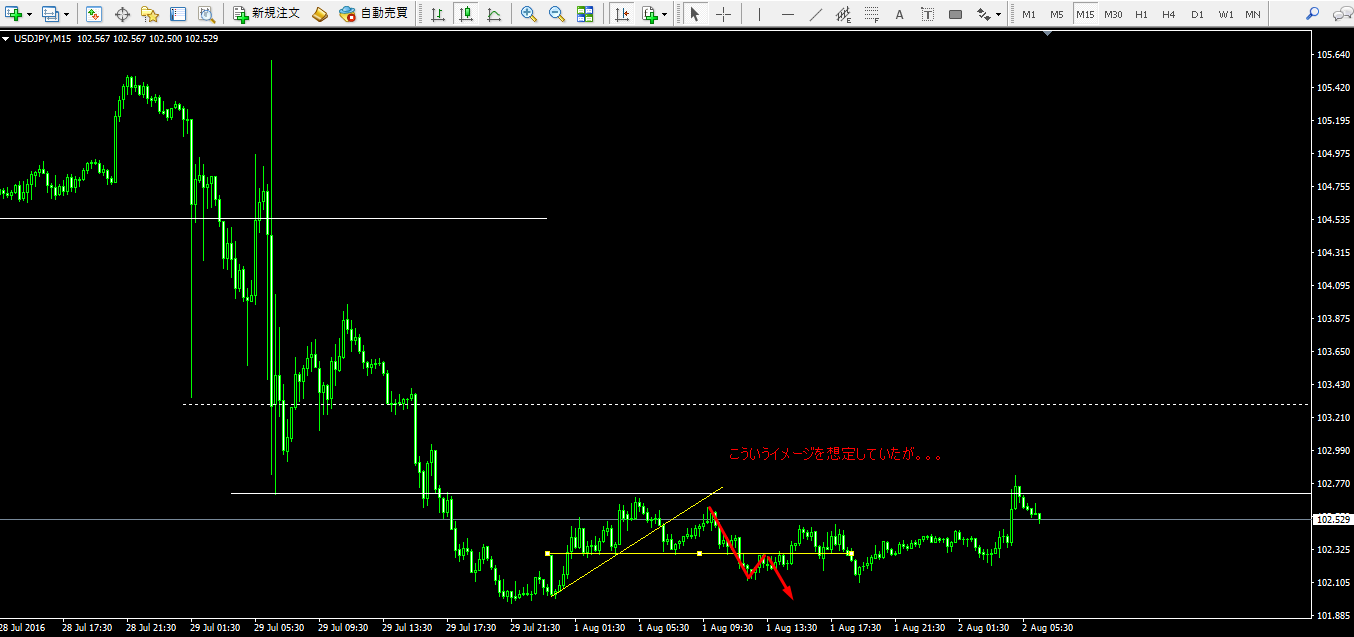 さて、昨日のUSD/JPYですが、下図のようなイメージをしていましたが、大型指標が控えていたためか、期待外れでした。
