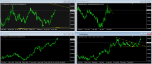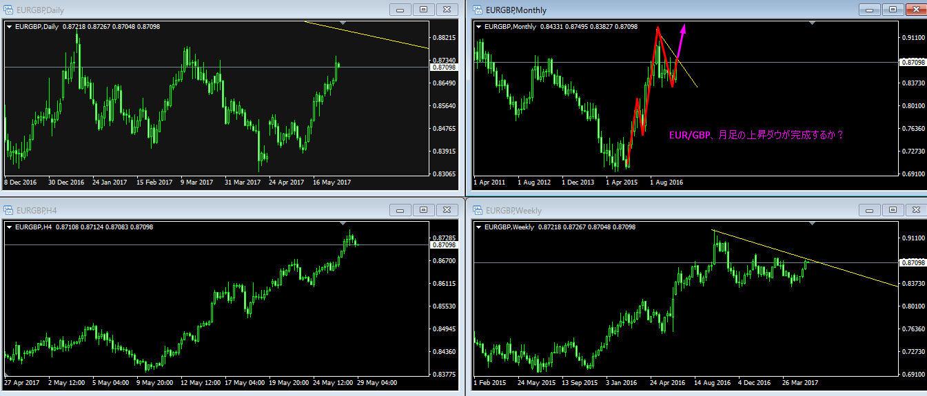 この通貨ペアーは、黄色のトレンドラインを上抜けすると、月足上昇ダウが完成する可能性があるので、興味深いです^^