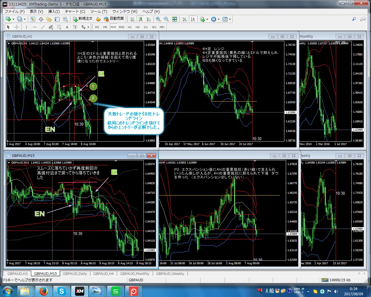 という事は、この部分でのエントリーは、最低でも15Mレベルで下図のようにしっかりレジサポ転換を確認しないと危険なわけです。(*1HのBBも閉じているので、出来れば1Hのレジサポ転換が欲しい・・・)
