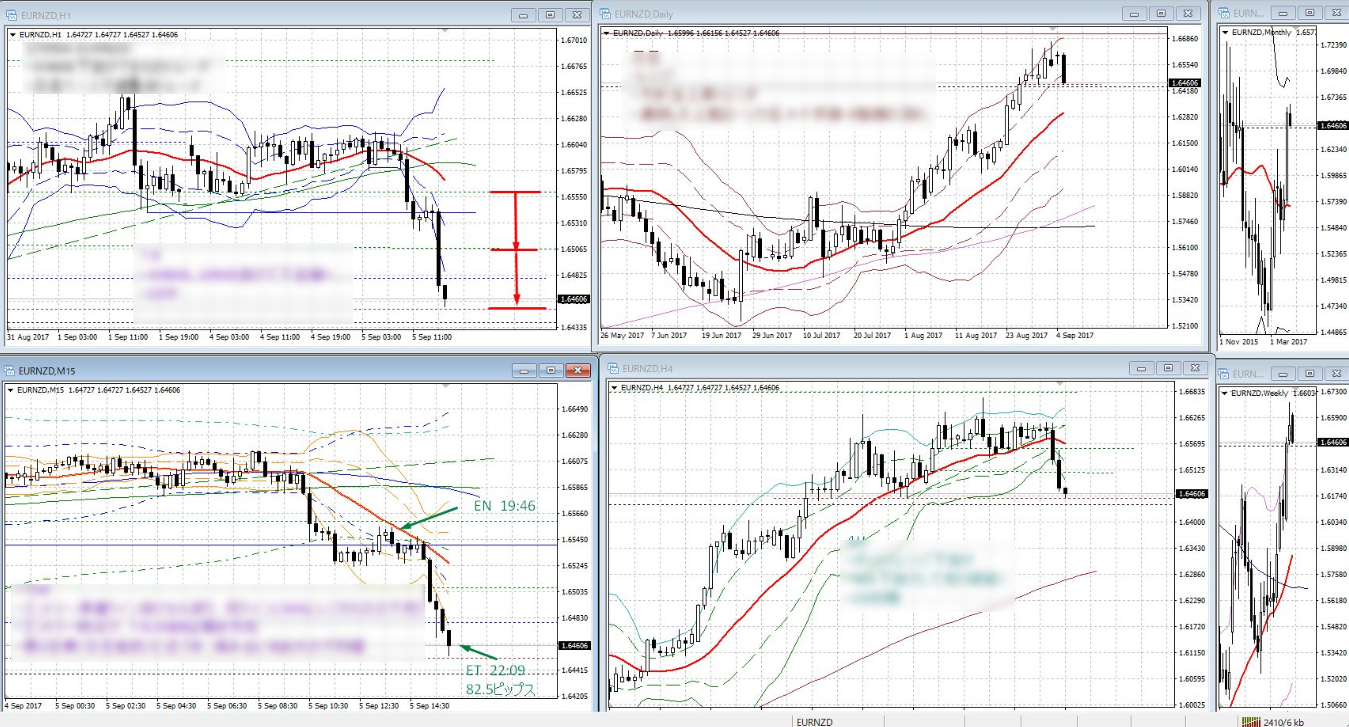 両者の違いは、EUR/GBPは日足ベースでミドル抜け、EUR/NZDは調整波ということだけ。しかし、4H以下の内部構造は必然的に同じです。